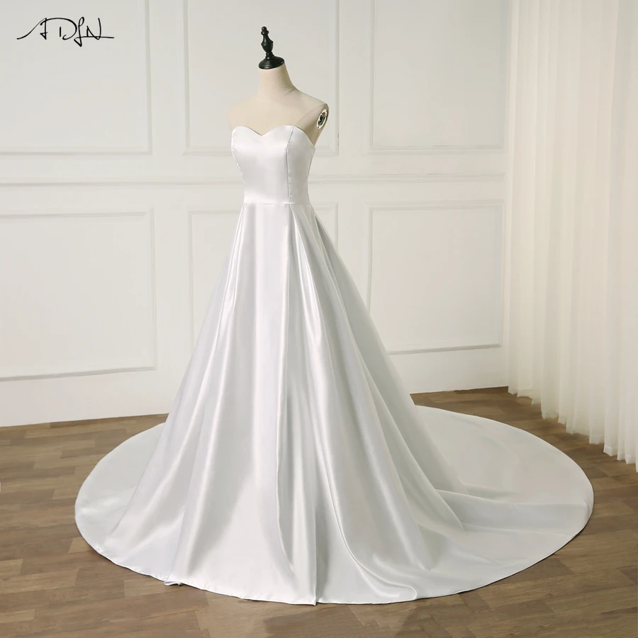 Though simple, this satin wedding dress is a far cry from plain. Lace up back fully lined: The top is pleated satin with a sweetheart neckline. Sometimes it is difficult to choose only one bridal dress for a wedding day. This bridal gown can be anything you want: